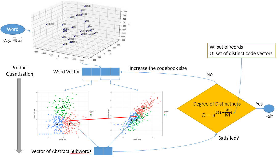 To encode a word to a vector of abstract subwords: First, a word is represented as a coordinate vector in word embeddings. Second, we product quantize the vector from step (1) to a vector of abstract subwords. Next, if degree of distinctness is satisfied, the algorithm exits; otherwise, we increase the codebook size, and perform product quantitation again.