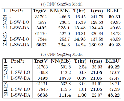 Model sizes (NN), training time (T) and inference time (t) are measured. We observe that in the English-to-Chinese translation task, the model sizes are reduced by \(37\%\) and \(77\%\) respectively with RNN and CNN; the training time is \(11\%\) and \(73\%\) shorter; and the inference time is nearly halved in RNN and \(36\%\) shorter in CNN.