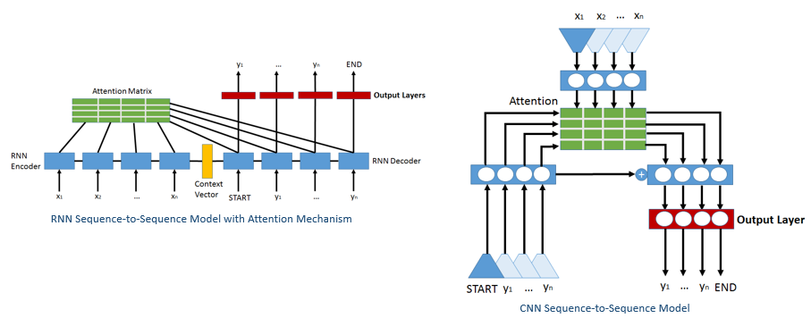 The sequence-to-sequence (seq2seq) models have been widely adopted in machine translation tasks. There are two important types of seq2seq models: the recurrent neural network (RNN) based seq2seq models [1] and the convolutional neural network (CNN) based sequence-to-sequence models [2]. The Recurrent Neural Network (RNN) sequence to sequence (seq2seq) model has RNNs as both its encoder and decoder. Compared to the RNN seq2seq models, the CNN seq2seq models substitute RNN components with CNN and allow much faster training while retaining the BLEU scores closely comparable to those obtained with RNN seq2seq models.